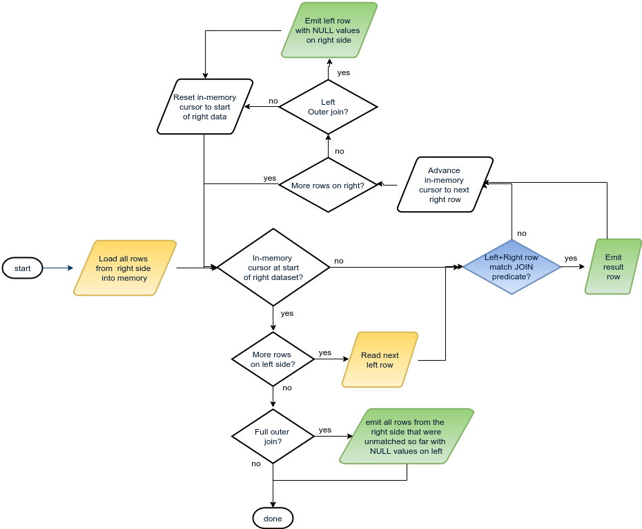 What this flowchart tells you: the algorithm reads all the rows from the JOIN’s right operand into memory and then, for each row read from the left operand, looks up the corresponding row in memory and produces the joined row if a match is found. Some extra conditions here and there deal with the NULL rows produced by OUTER JOIN when no match is found.