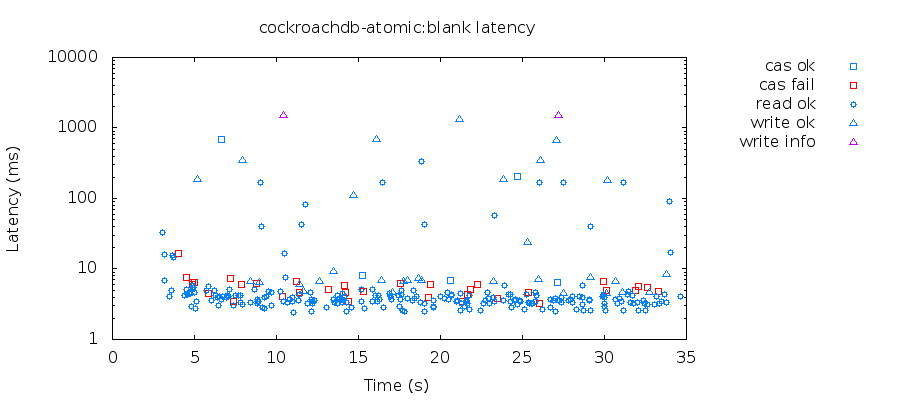 Since CockroachDB also claims correctness in the face of adversity, we wanted to let Bad Things happen to our database and see how it responds. Like Aphyr often does, we started subjecting our 5-node database cluster to random network partitions while running the compare-and-set test. When we do so, we see the following happening: