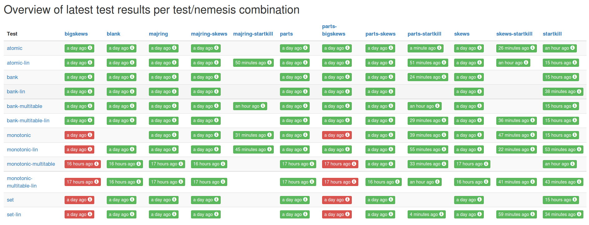 Once this infrastructure was in place, we used it to check whether CockroachDB would get confused if we injected clock skews during a network partition, or vice-versa. It didn’t — at least not any more than determined earlier. We then automated the generation of a handy test result overview:
