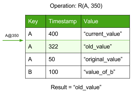 Read operations on a key return the most recent version with a lower timestamp than the operation: