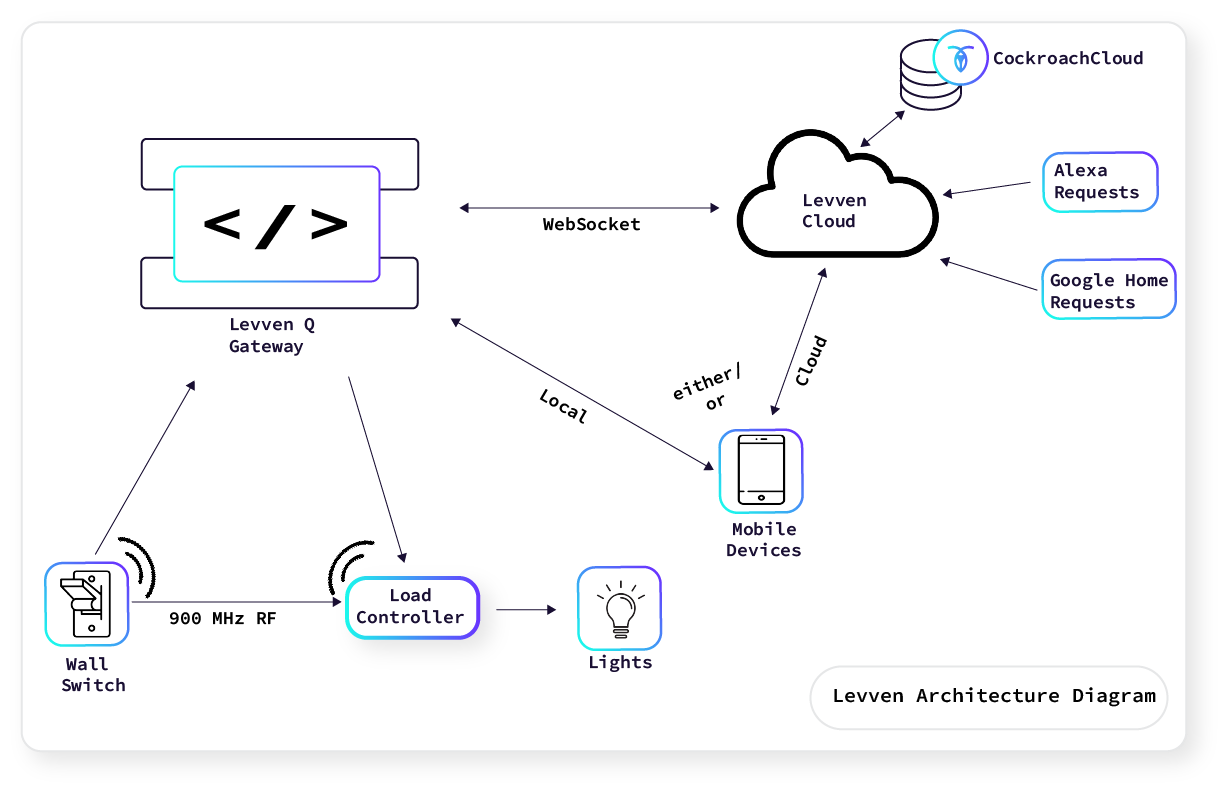 A light switch and the load controller are not internet connected. They are connected over a 900 megahertz RF network. The gateway is what bridges the controls with the cloud and access for mobile apps. It listens in on the radio communications and sends it to Levven’s servers. That is where the app connects to the home and can perform actions. What’s important to note here is that even without the internet all your home controls will continue to function intelligently. So if a region fails, the lightswitch will continue to work.