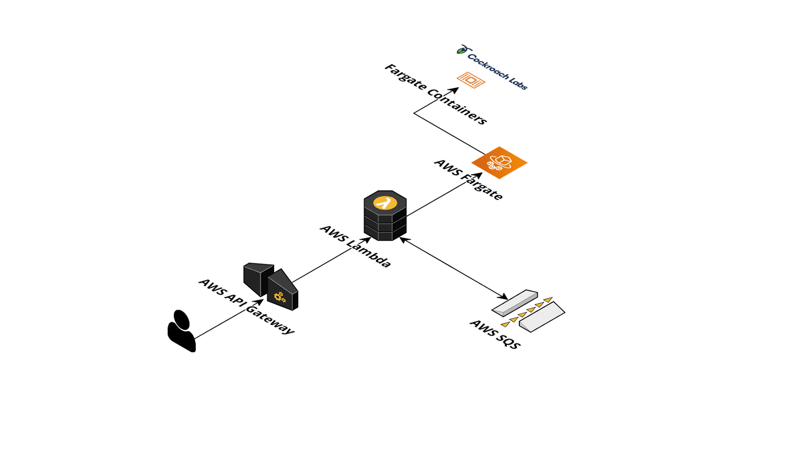 Here is how the application architecture functions: The platform is built in the AWS cloud. User requests are handled by Route53 DNS resolution. Requests are sent to Cloudfront (the AWS content delivery network (CDN)). Static content like image assets are delivered from an S3 bucket. Other requests are handled by API Gateway. Each API Gateway request is handled by Lambda, which is the serverless platform in AWS that can run stateless application code so nobody has to think about where the code is running. The Lambdas have a 30-second timeout, so longer requests are sent to an SQS queue for processing by async Lambdas, which have a 15-minute timeout. Shorter requests are handled synchronously by fetching data and performing business logic. Some user content is in another S3 bucket, while other data is stored in a CockroachDB cluster.
