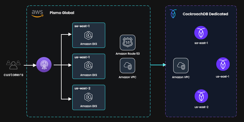 As Pismo expands globally, they need to be ready to deploy anywhere while respecting the legal obligations of data storage. Given these requirements, they are deploying CockroachDB Dedicated on Kubernetes to achieve horizontal scale and distribution. They are hosting via AWS with plans to add regions on other cloud providers in the future.