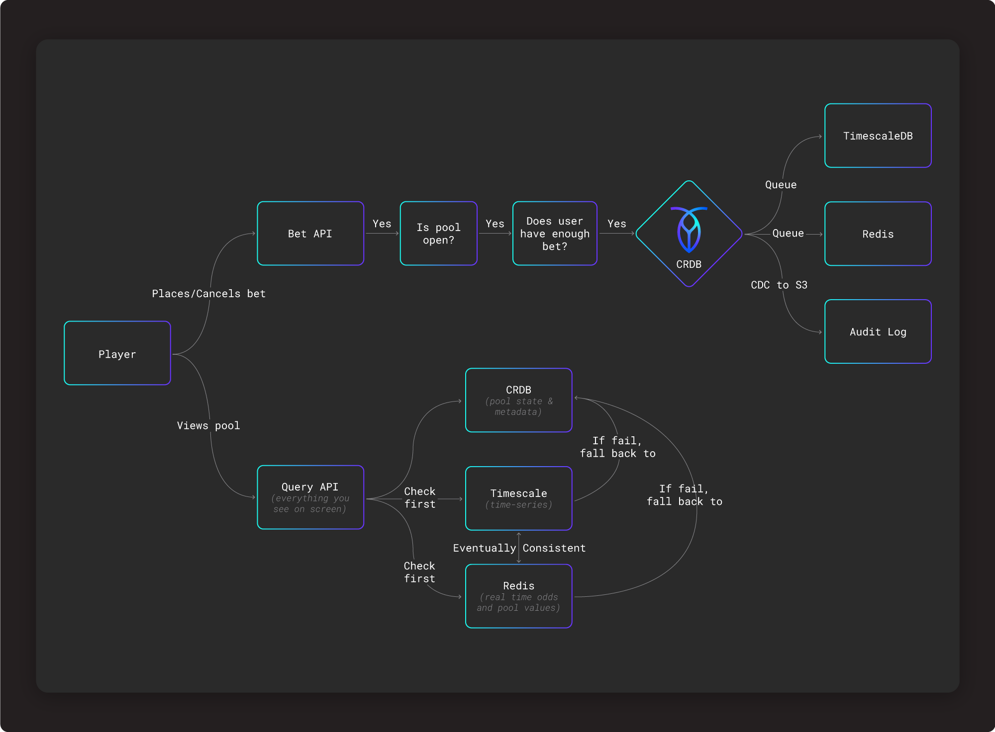 For this system to work, CockroachDB’s CDC capabilities are extremely important since it creates an audit log of every transaction (bet slip, pool, user account value) and constantly updates it to Amazon S3. This is crucial for two reasons 1) they can replay every transaction state in the event that they need to debug the system or trace money 2) if regulators ever need to see a report for fraud investigation, they can go back and show every transaction.”